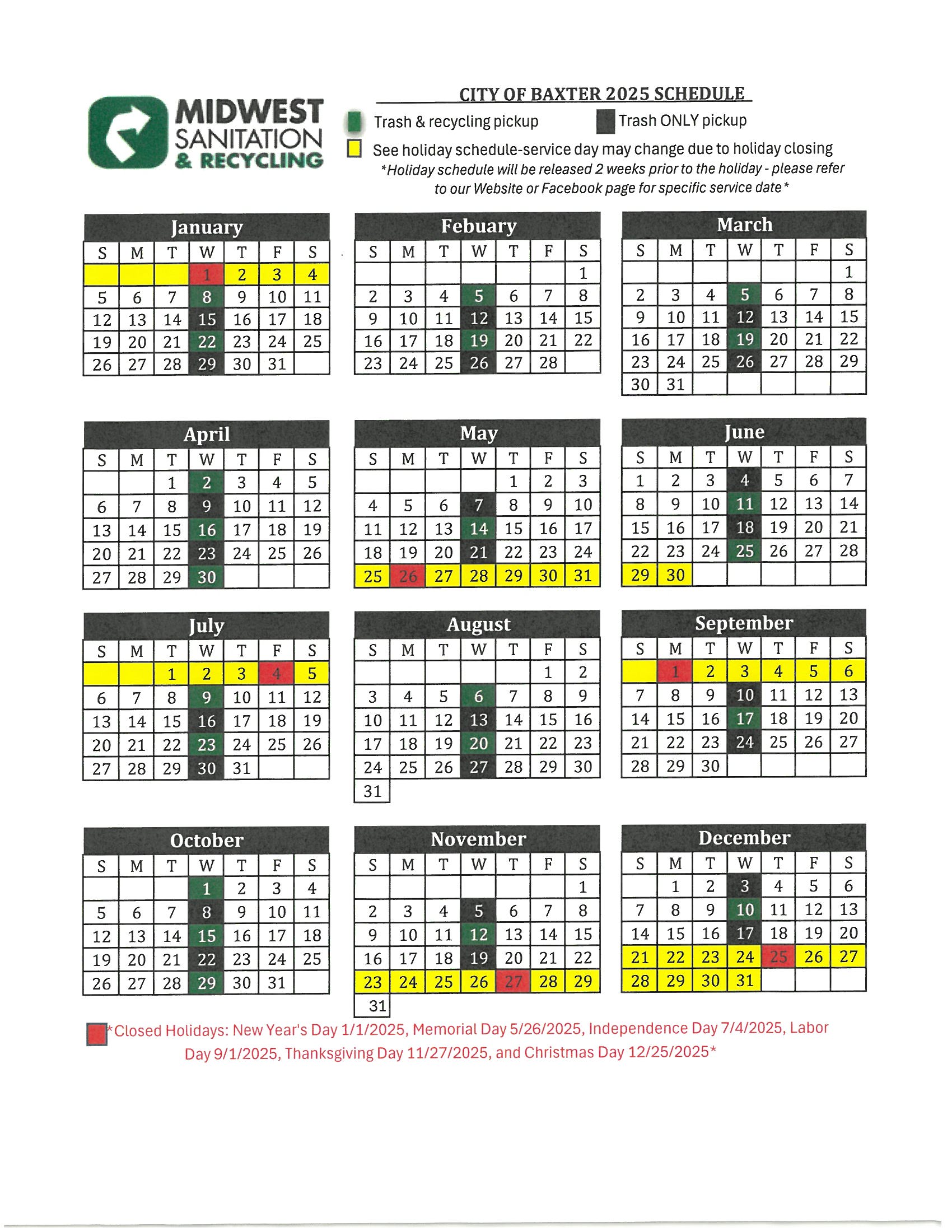 2025 Service Calendars