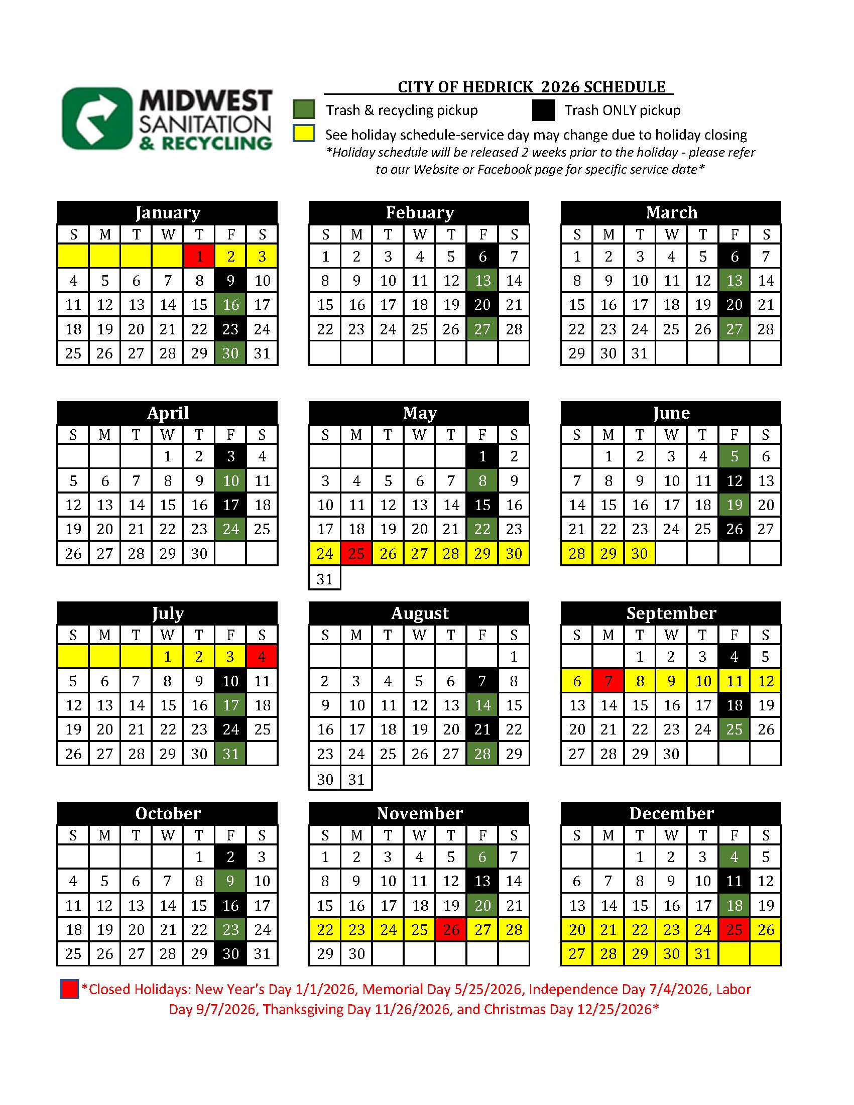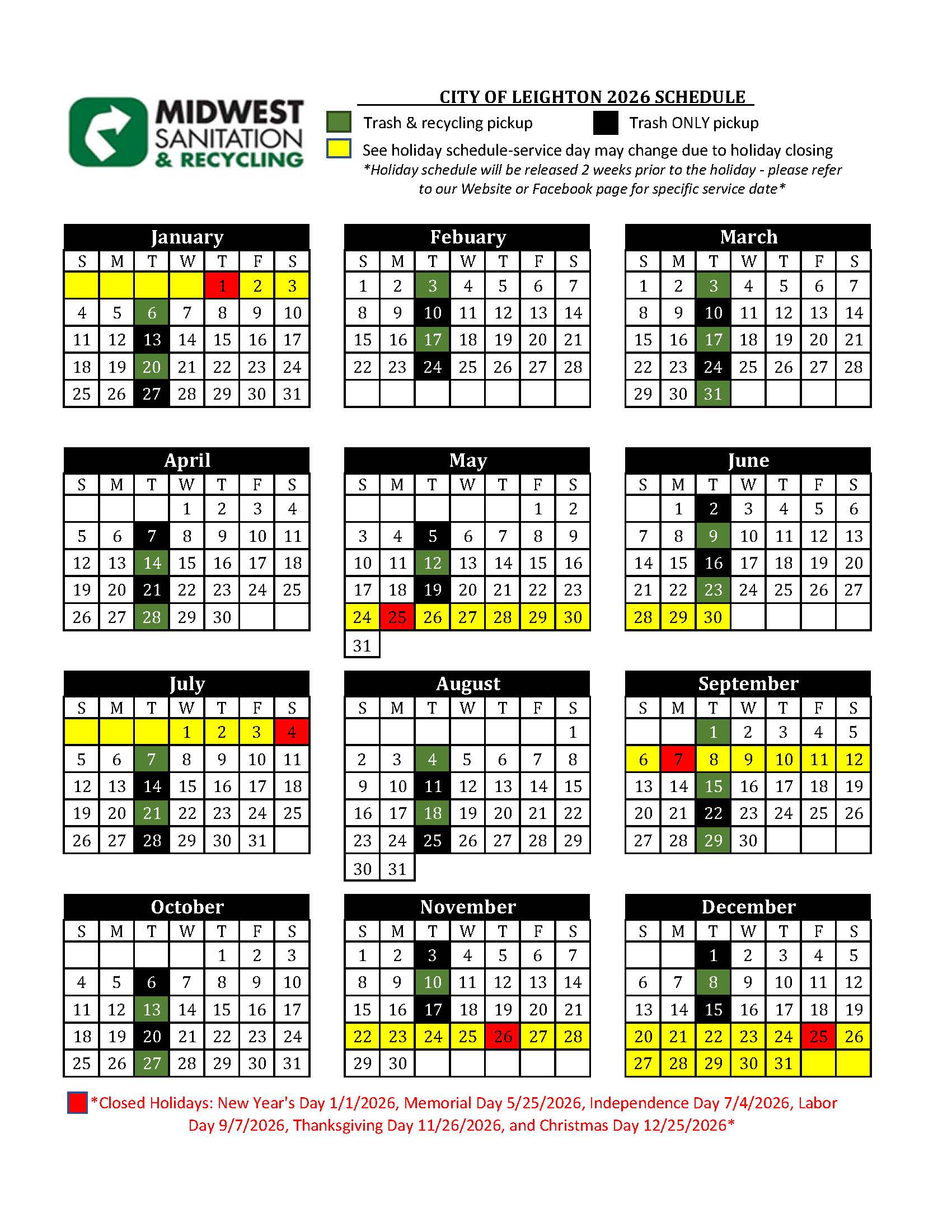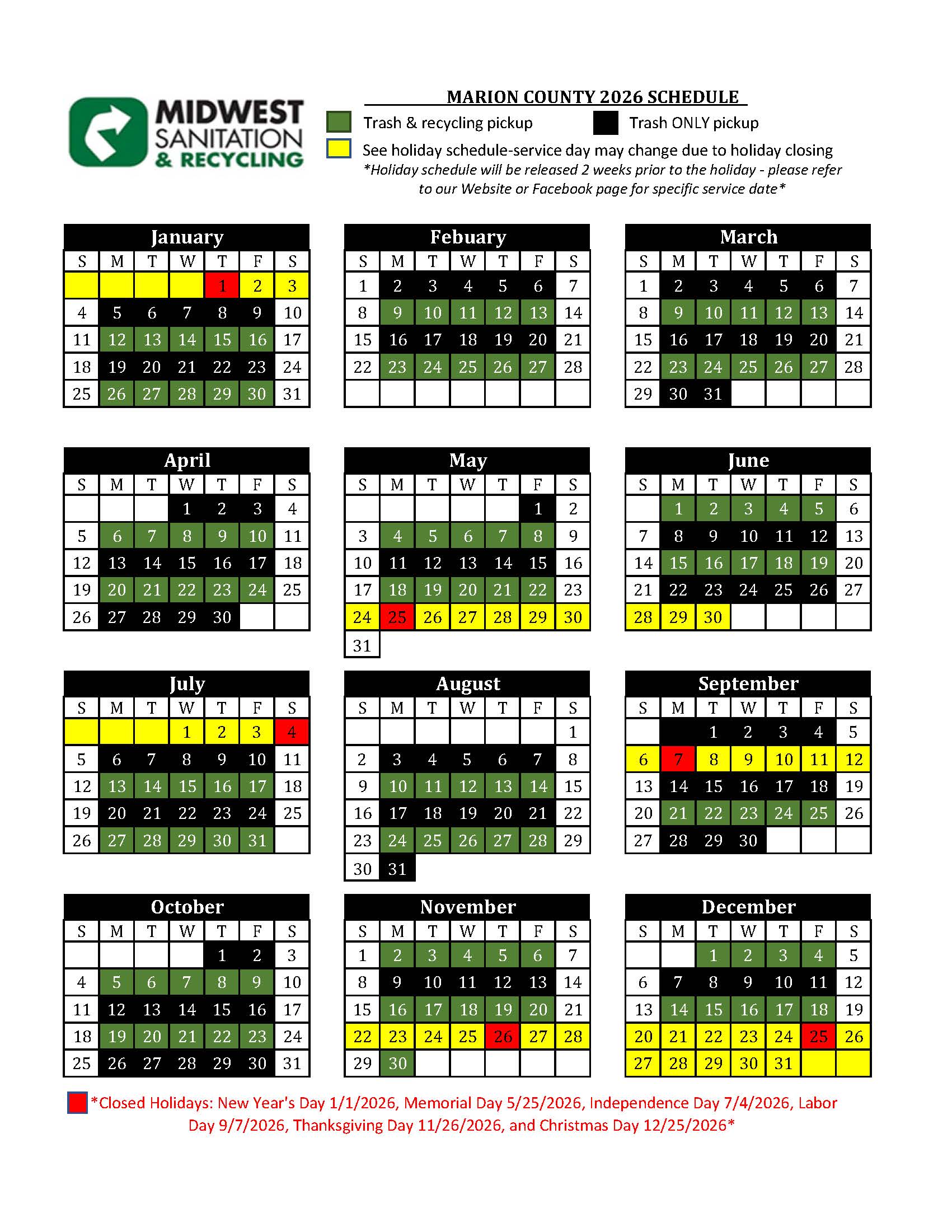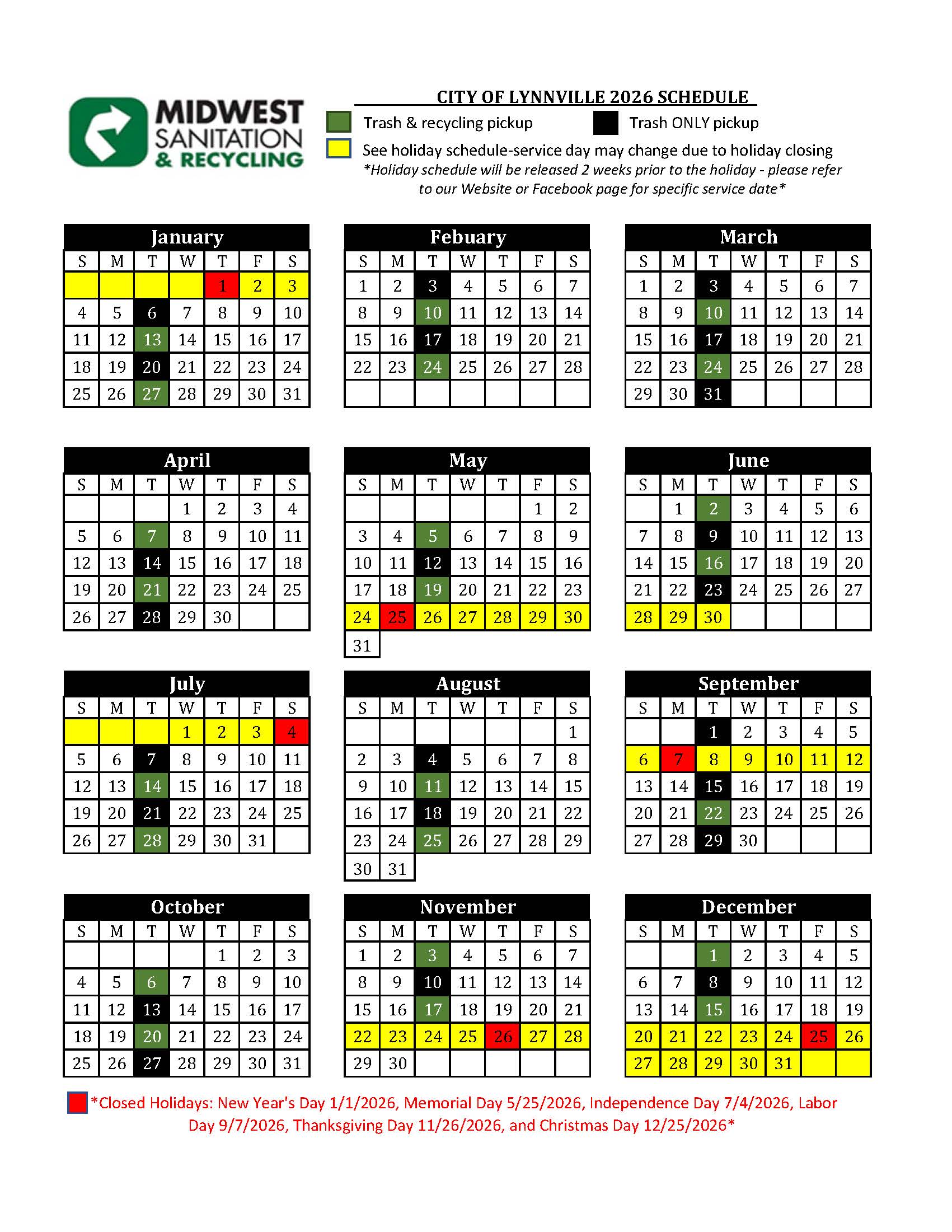 2026 Service Calendars