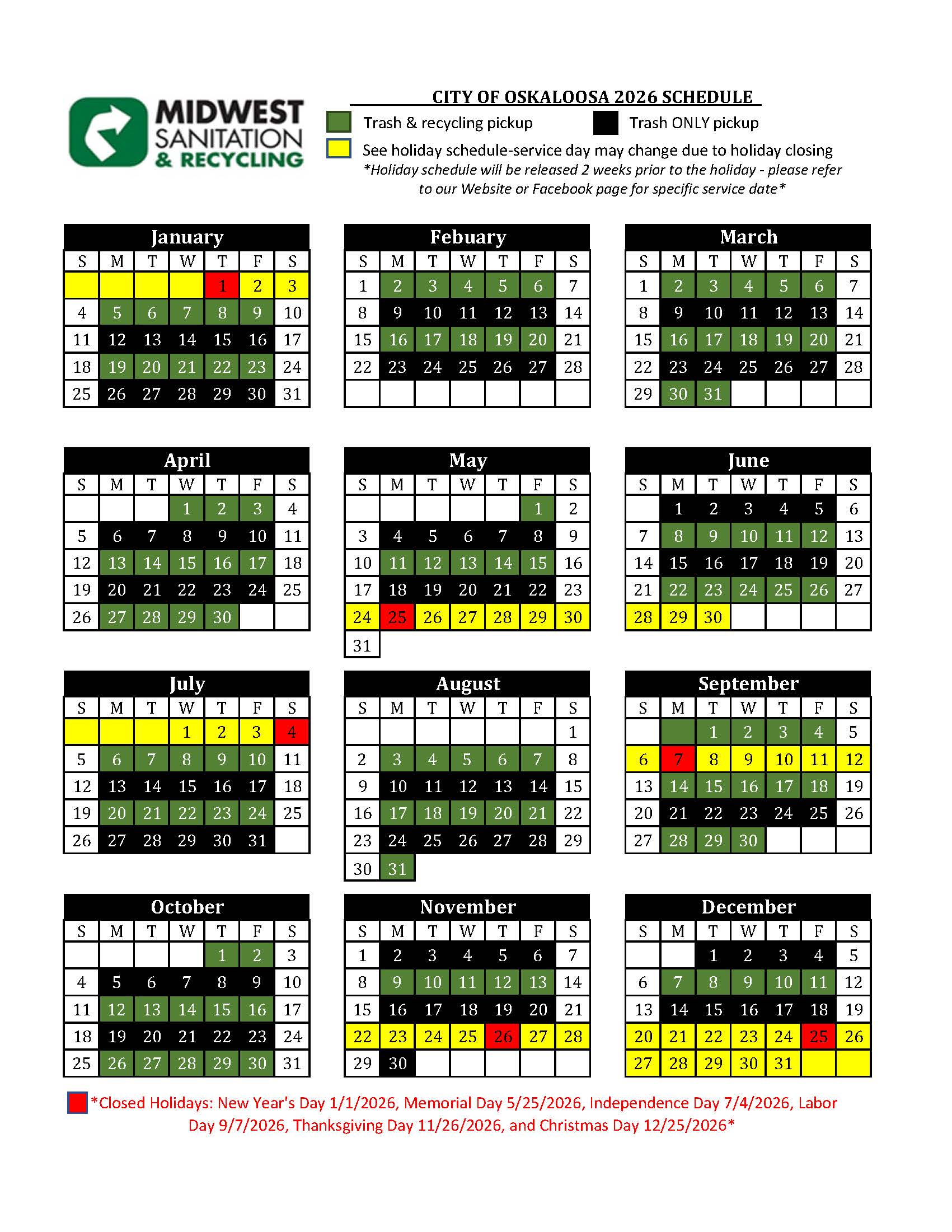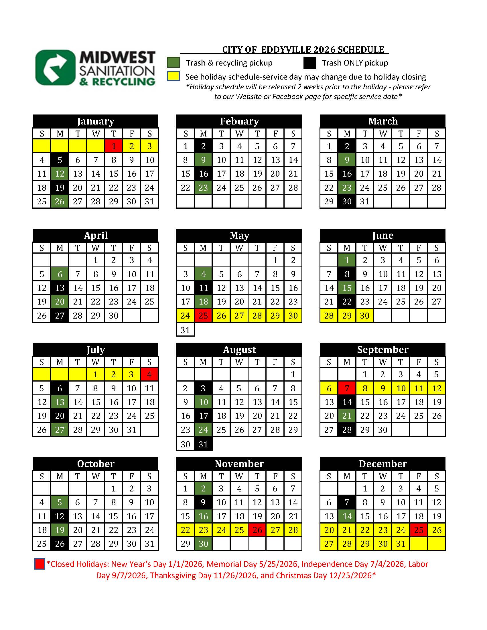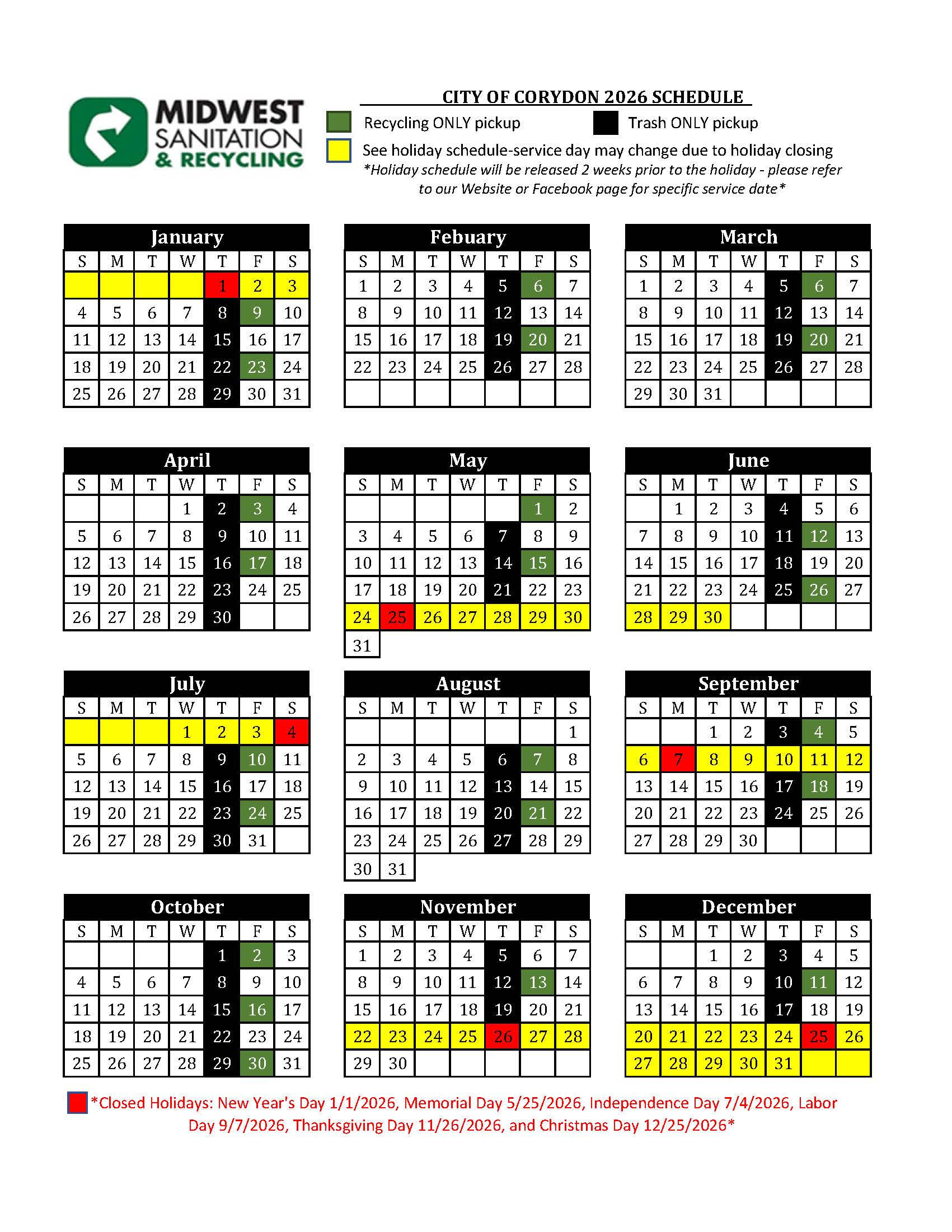 2026 Service Calendars