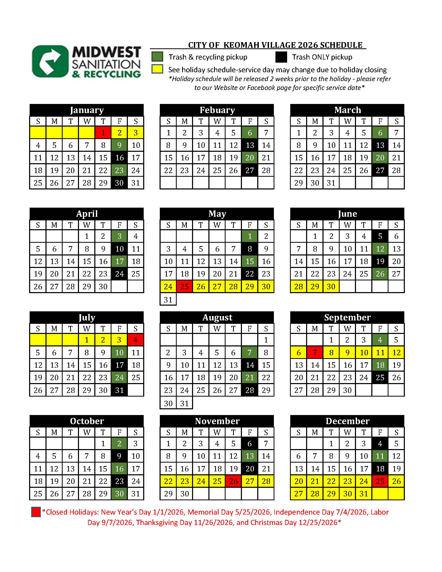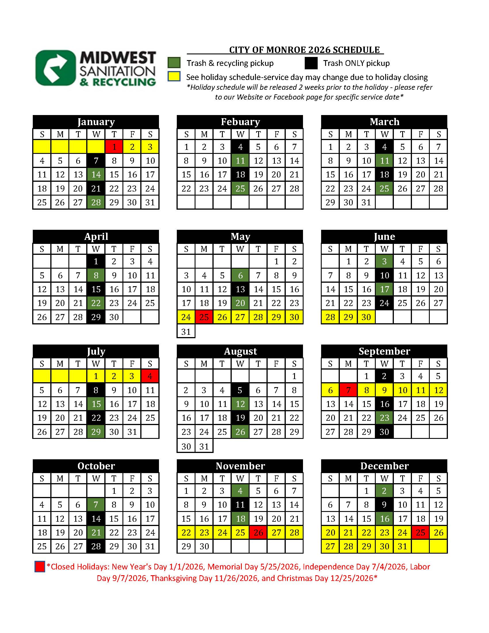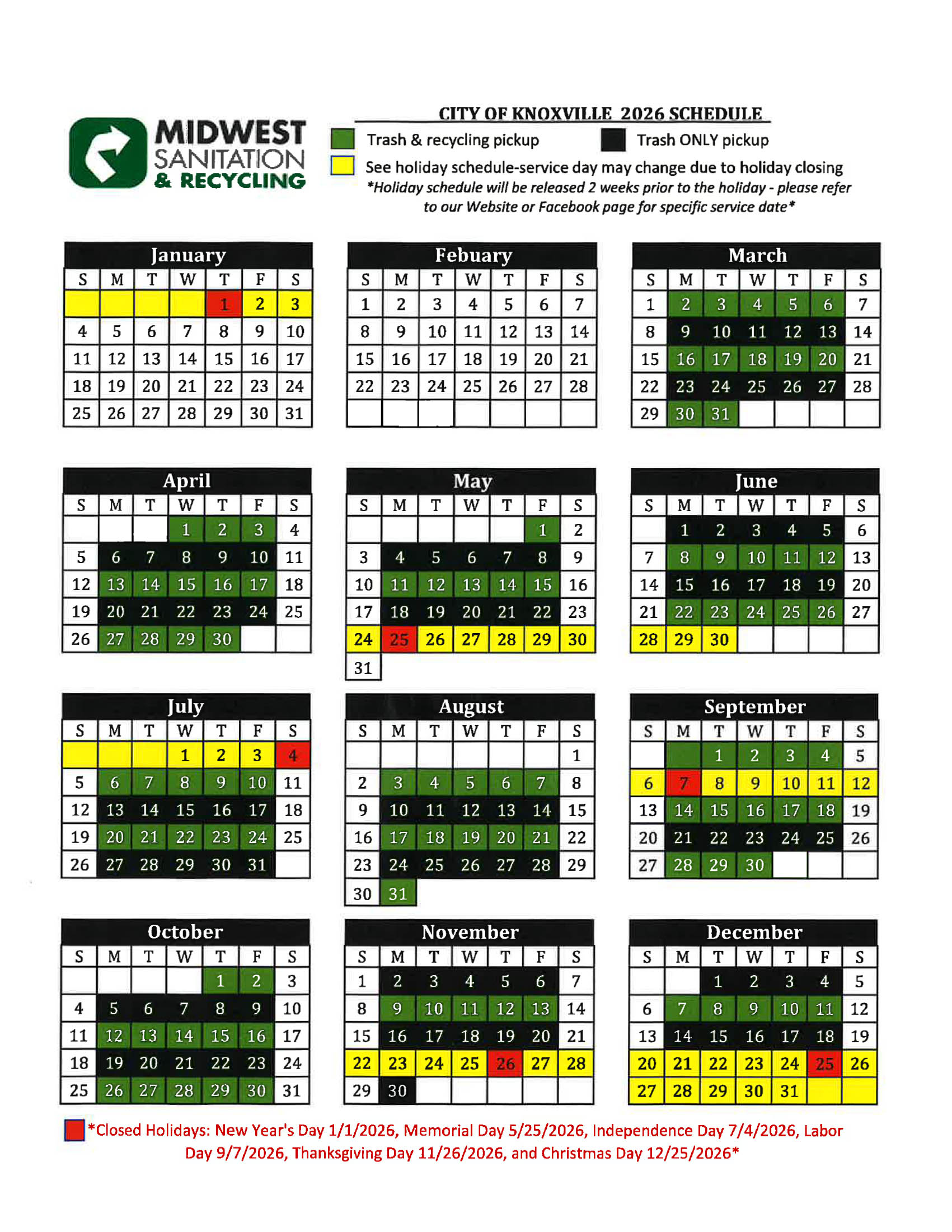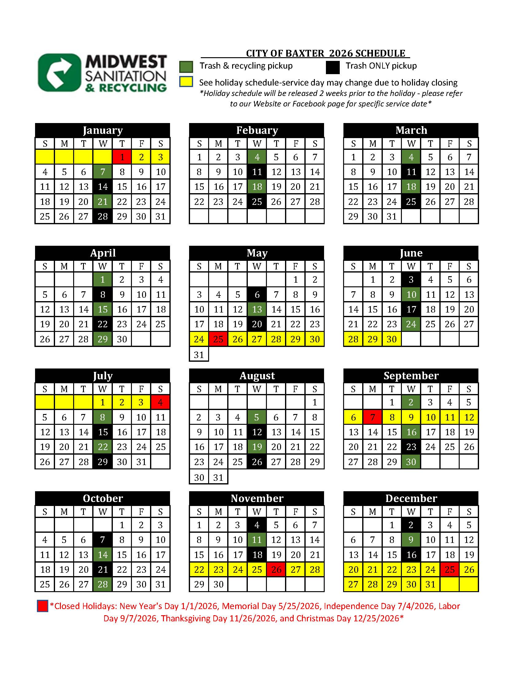 2026 Service Calendars